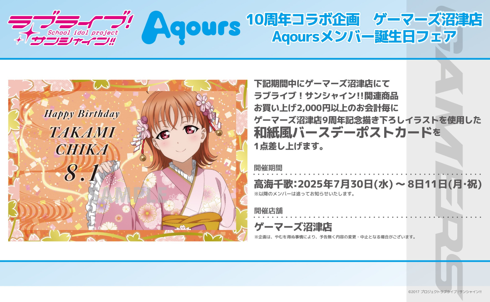 下記期間中にゲーマーズ沼津店にてラブライブ!サンシャイン!!関連商品お買い上げ2,000円(税込)以上のお会計毎にゲーマーズ沼津店9周年記念描き下ろしイラストを使用した和紙風バースデーポストカード を1点差し上げます。