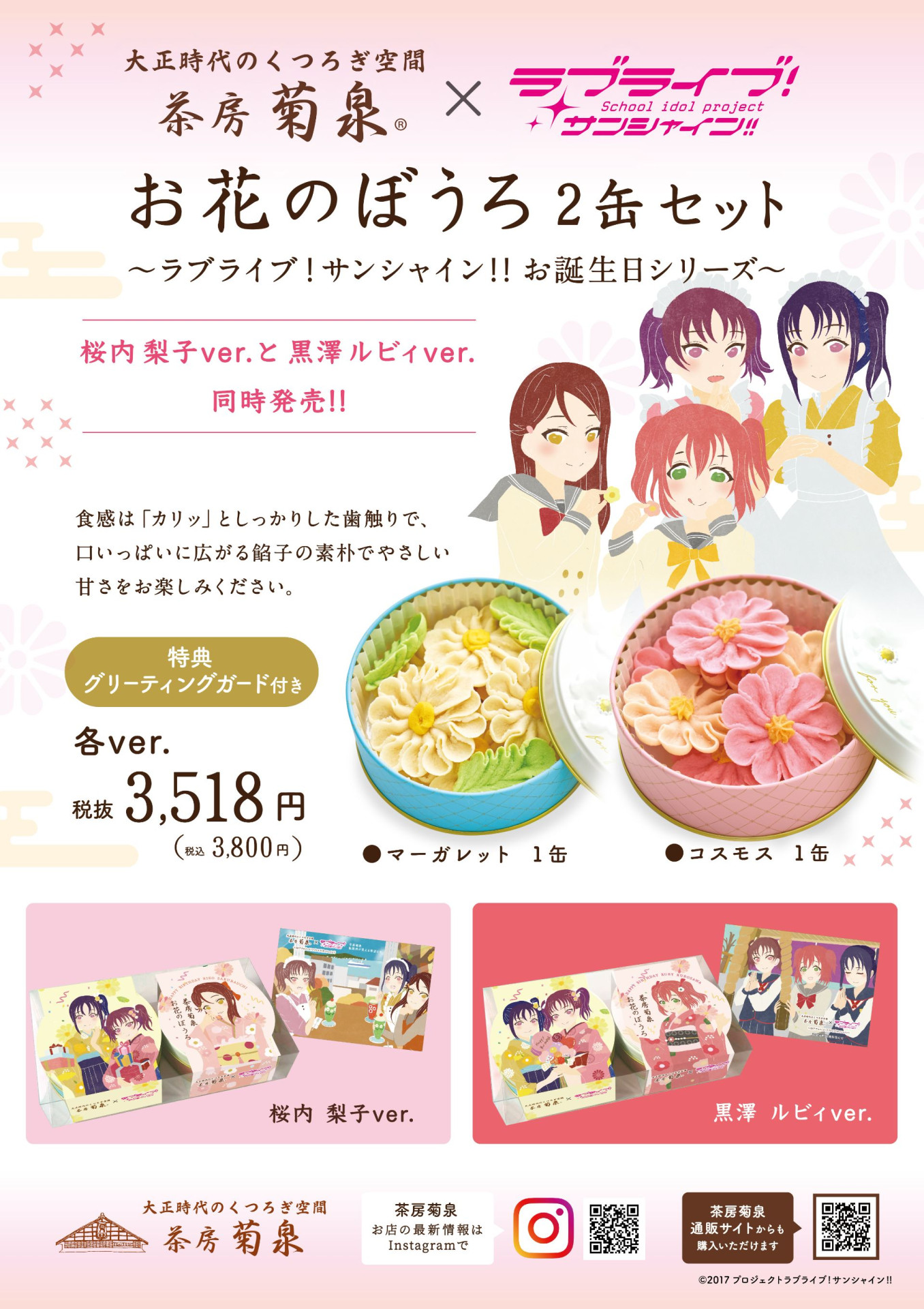 函館”茶房菊泉”から”お花のぼうろ2缶セット~ラブライブ!サンシャイン‼お誕生日シリーズ~桜内梨子バージョン”、”黒澤ルビィバージョン”2商品同時発売のお知らせです。